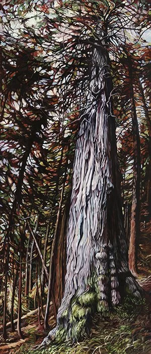 Each painting is a tribute to the magic of Vancouver Island forests — flowing bark, shifting light, and dancing tangles of limbs — rooted, resilient, and alive with memory. Each tree has its own story.
